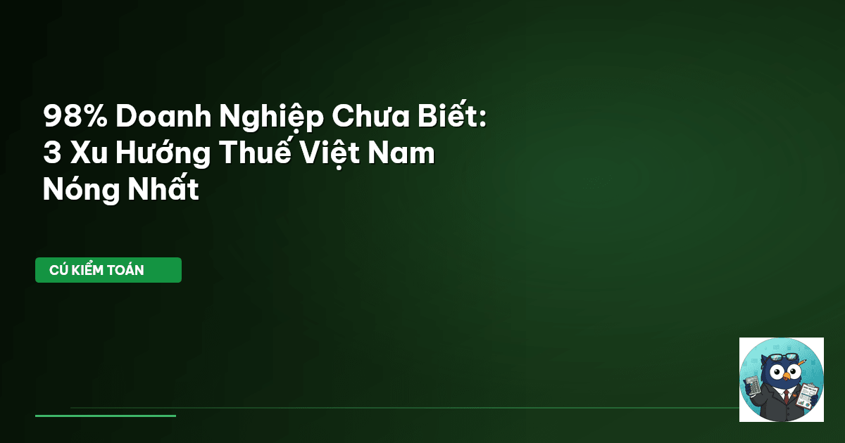 ⏱️ 9 phút đọc · 1775 từ Giới Thiệu: Đừng Ngủ Quên Với Thuế – Kinh Tế Số và Toàn Cầu Đang Thay Đổi Cuộc Chơi Thời gian không chờ đợi ai, và chính sách thuế cũng vậy. Năm 2026 đang mở ra những chương mới đầy thách thức và cơ hội cho doanh nghiệp, cá nhân tại Việt Nam. Không nắm rõ luật, rủi ro. Nắm vững, cơ hội. Đừng để mình thuộc số 98% doanh nghiệp, cá nhân vẫn còn loay hoay, không biết những xu hướng thuế nào đang thực sự định hình lại bức tranh tài chính nước nhà. Cú Kiểm Toán đã soi kỹ, và đâ…