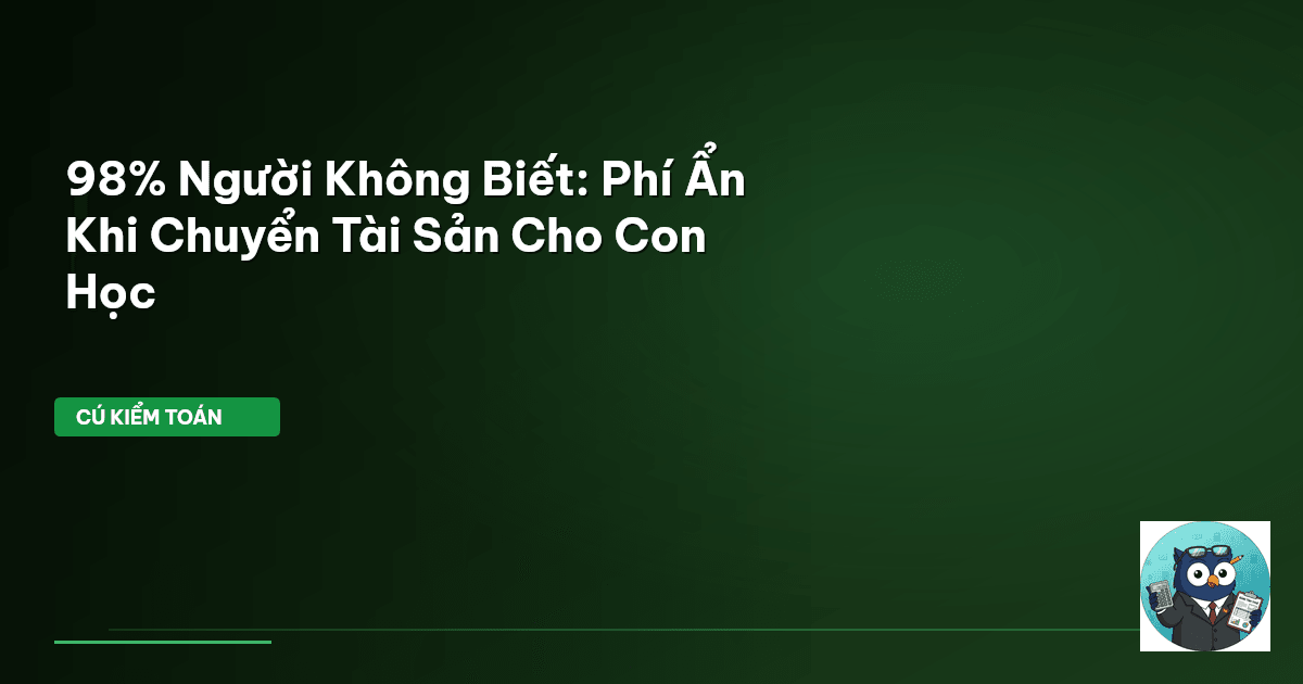 ⏱️ 11 phút đọc · 2041 từ Giới Thiệu: Chuyển Giao Tài Sản Cho Con — Phí Ẩn Nào Đang Chờ? Thời đại số, con cái chúng ta học online, chi phí không hề nhỏ. Nhiều bậc phụ huynh chọn cách chuyển giao tài sản, tích lũy từ nhiều năm, nhằm đảm bảo tương lai giáo dục vững chắc cho con. Nhưng liệu bạn đã soi kỹ những khoản thuế và phí tiềm ẩn khi thực hiện việc này? Cú Kiểm Toán nhận thấy, nhiều người Việt Nam vẫn tin rằng không có "thuế thừa kế" trực tiếp, và điều đó hoàn toàn đúng. Tuy nhiên, việc chuyển…