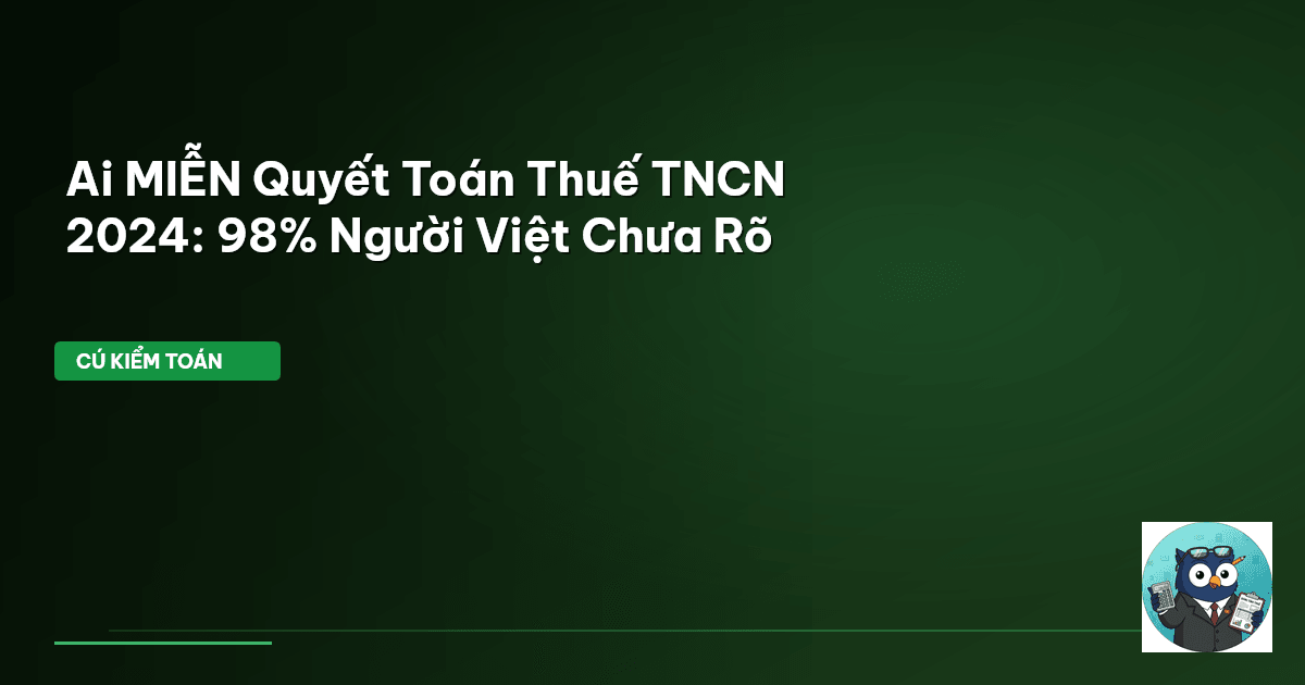 ⏱️ 10 phút đọc · 1938 từ Giới Thiệu: Đừng Để Quyết Toán Thuế Lấy Mất Thời Gian Của Bạn Đầu năm tài chính, câu hỏi muôn thuở lại xuất hiện: Liệu tôi có phải quyết toán thuế thu nhập cá nhân (TNCN) cho năm 2024 không? Nhiều người nghĩ rằng cứ có thu nhập là phải làm, hoặc cứ thấy ai đó làm thì mình cũng làm theo. Đây là sai lầm phổ biến. Cú Kiểm Toán nhận thấy 98% người nộp thuế Việt Nam vẫn chưa nắm rõ các trường hợp cụ thể được miễn quyết toán, dẫn đến lãng phí thời gian, công sức hoặc tệ hơn là…