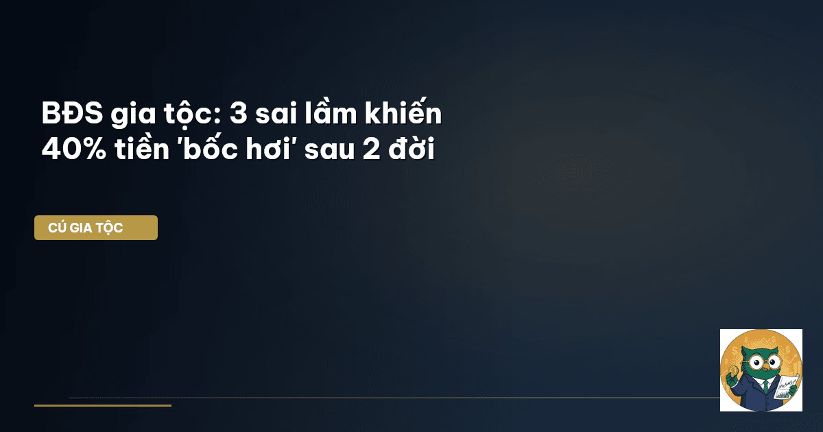 ⏱️ 14 phút đọc · 2781 từ Giới thiệu: Gia sản 40% 'bốc hơi' vì đâu? Ông bà ta thường có câu "tấc đất tấc vàng", ngụ ý về giá trị vô biên của đất đai, bất động sản. Thực vậy, không ít gia tộc Việt Nam đã gây dựng nên cơ nghiệp đồ sộ chỉ từ vài miếng đất, vài căn nhà được tích lũy qua nhiều thế hệ. Nhưng Ông Chú Vĩ Mô cũng thấy rằng, một nghịch lý lớn đang tồn tại: nhiều gia sản quý giá, tích lũy bằng mồ hôi và nước mắt của bao đời, lại có nguy cơ 'bốc hơi' đến 40% giá trị chỉ sau hai thế hệ chuyển…