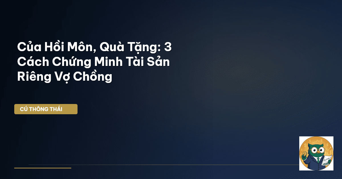 Cú Thông Thái⏱️ 20 phút đọc⏱️ 14 phút đọc · 2729 từ Giới Thiệu: Nồi Cơm Chung – Cái Chén Riêng Của Ai? Mấy đứa F0, nhất là mấy cặp mới cưới, hay sắp cưới, có bao giờ ngồi lại mà ngẫm: cái nhà này, cái xe kia, hay thậm chí là mấy món vàng của hồi môn, liệu có phải của riêng mình không? Nghe có vẻ xa vời, nhưng đây chính là câu chuyện tài chính nền tảng mà rất nhiều gia đình Việt đang loay hoay, hoặc thậm chí là bỏ qua. Rồi đến lúc có chuyện, lại tiếc hùi hụi vì không chuẩn bị kỹ càng. Thật ra, việc xác định tài sản riêng v…