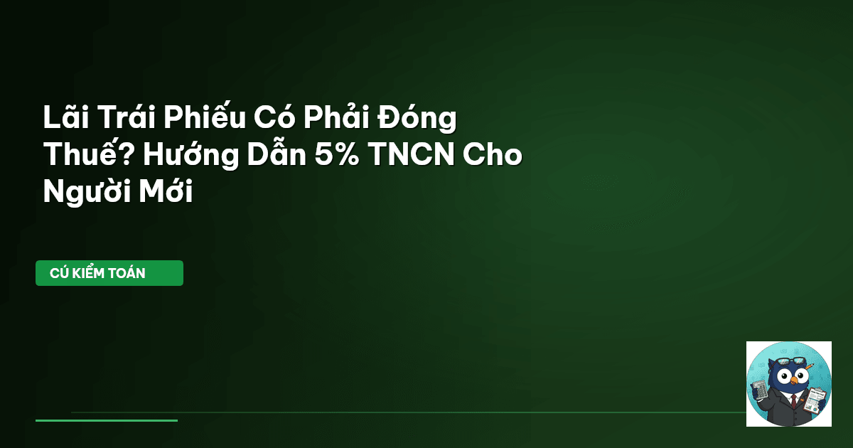 ⏱️ 14 phút đọc · 2751 từ Giới Thiệu Thị trường trái phiếu ngày càng thu hút, đặc biệt là với các nhà đầu tư mới (F0). Nhưng có một con số ít người để ý: thuế thu nhập từ lãi trái phiếu . Đây không phải chuyện nhỏ. Nhiều người nghĩ lãi cứ về tài khoản là của mình, nhưng Cú Kiểm Toán xin đính chính: Không hẳn vậy! Có 5% bị "soi" ngay tại nguồn. Thực tế, thu nhập từ đầu tư vốn, bao gồm lãi trái phiếu, thuộc diện chịu thuế thu nhập cá nhân (TNCN) theo một tỷ lệ nhất định. Điều này được quy định rõ r…