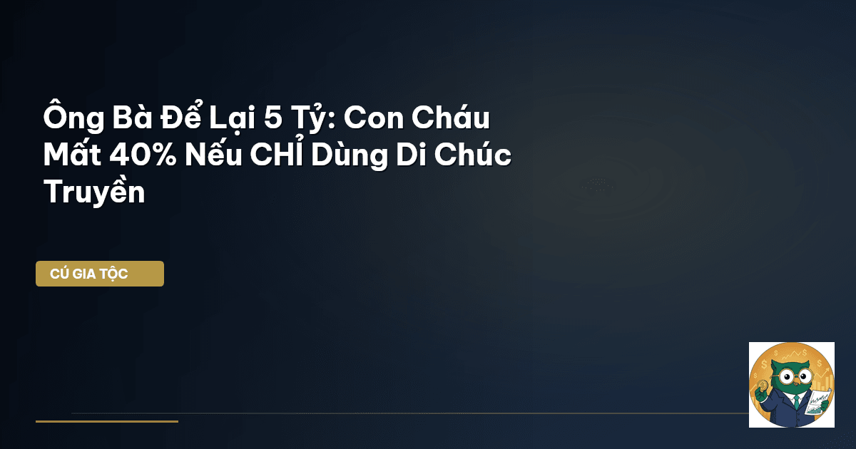 ⏱️ 14 phút đọc · 2714 từ Giới Thiệu: Di Sản 5 Tỷ – Cần Hơn Một Tờ Di Chúc Cũ Kỹ Trong văn hóa Việt Nam, việc tích lũy tài sản cho con cháu là một truyền thống đẹp, thể hiện tấm lòng của ông bà, cha mẹ. Từ mảnh đất tổ, căn nhà mặt phố cho đến cơ nghiệp kinh doanh, tất cả đều là thành quả của bao nhiêu năm chắt chiu, đổ mồ hôi nước mắt. Thế nhưng, ít ai ngờ rằng, một khối tài sản khổng lồ, ví dụ như 5 tỷ đồng mà ông bà để lại, có thể hao hụt tới 40% chỉ vì một điều đơn giản: không có một chiến lượ…