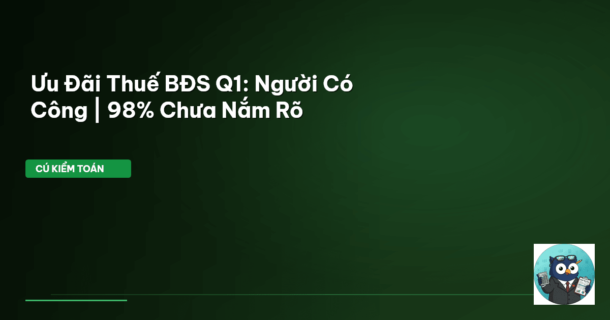 ⏱️ 13 phút đọc · 2432 từ Giới Thiệu: Cơ Hội Tiết Kiệm Thuế Bất Động Sản Quý 1/2026 Trong bối cảnh kinh tế đầy biến động, mỗi khoản tiết kiệm, dù nhỏ nhất, đều có ý nghĩa lớn. Đơn cử, giá xăng RON 95 tại Việt Nam hiện là 23.540 VND/lít, thấp hơn Thái Lan (25.776 VND/lít) hay Singapore (74.698 VND/lít), nhưng vẫn là một phần đáng kể trong chi tiêu hàng tháng. Với những người có công với cách mạng, việc nắm bắt và tận dụng các chính sách ưu đãi là điều Cú Kiểm Toán luôn khuyến khích. Bởi lẽ, việc n…